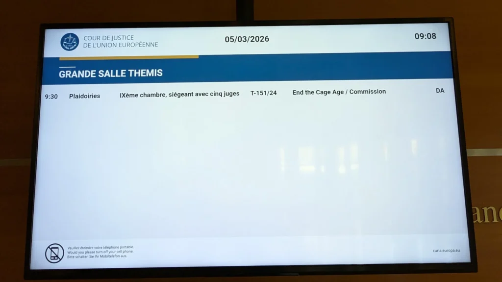 Oggi, 5 marzo 2026, si è tenuta presso la Corte di Giustizia dell’Unione europea a Lussemburgo l’udienza sul ricorso presentato dagli organizzatori della Iniziativa dei cittadini “End the Cage Age” contro la Commissione europea per la mancata proposta legislativa volta a vietare l’uso delle gabbie negli allevamenti.