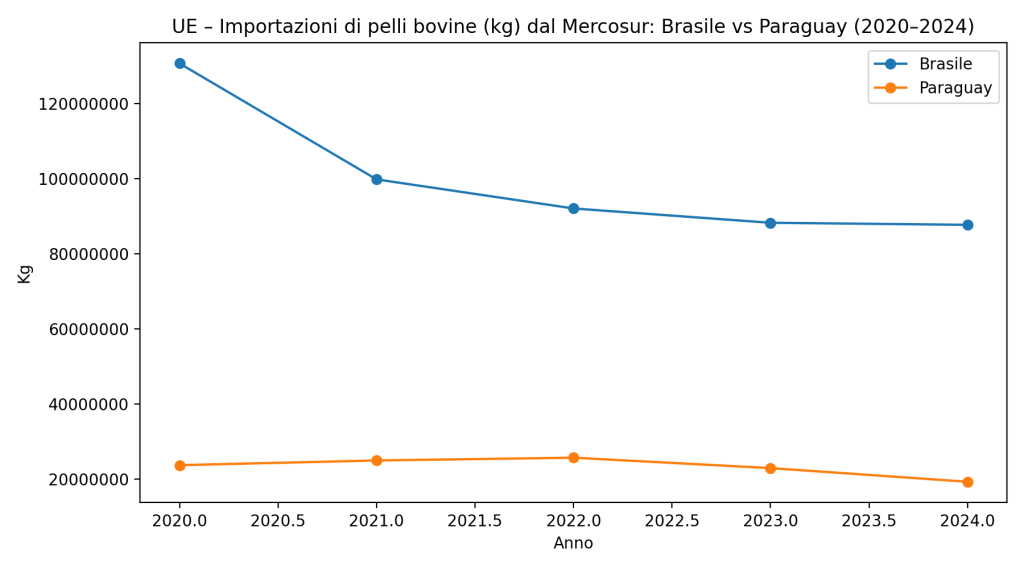 - Dal Paraguay si importano 19.277.914 kg di pelli, ovvero circa 0,64–0,77 milioni di bovini.