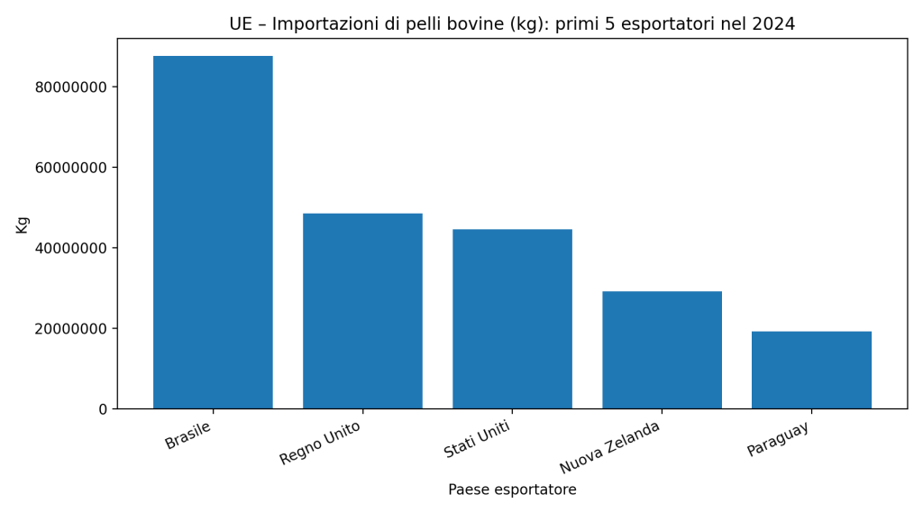 - Dal Brasile si importano 87.652.337 kg di pelli, che corrispondono ad una stima di 2,9–3,5 milioni di bovini.